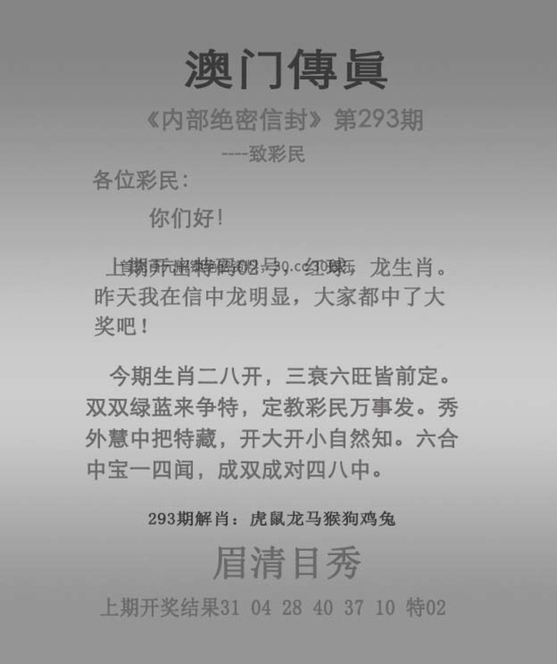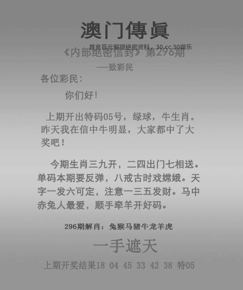 296期澳门传真:今期生肖三九开,二四出门七相送。单码本期要反弹,八戒古时戏嫦娥。天字一发六可定,注意一三五发财。马中赤兔人最爱,顺手牵羊开好码。